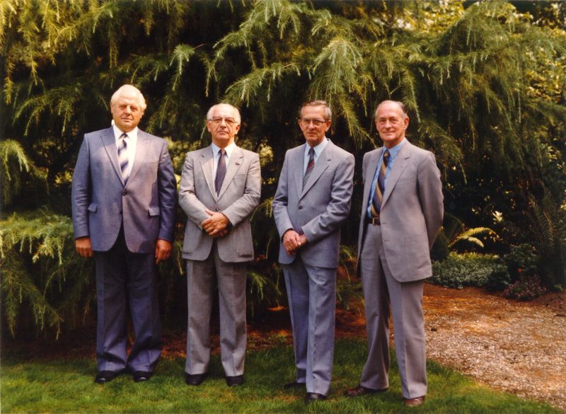 Gemeentehuis / Gemeentebestuur | College van Burgemeester en Wethouders periode 1978-1982. v.l.n.r. G.H.J.L. Heldens, wethouder, J.T. Hendrix, burgemeester, P.J. Vincent, wethouder en R.E.C. Hover, secretaris. Foto genomen in de tuin van de zusters aan de Pastoor Vranckenlaan. | Pastoor Vranckenlaan 4 | Reuver | 29-8-1982 | 1982 | |||