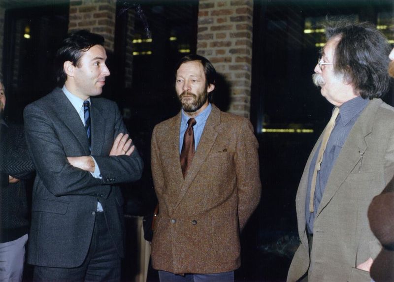 Bezoek minister W.V.C., L.C. Brinkman, aan gemeente Beesel. v.l.n.r. Minister Brinkman, Joep Nicolas (kunstenaar) en Harry Op de Laak (kunstenaar) |
