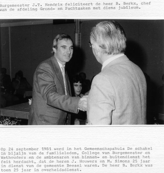 Gemeentehuis / Gemeentebestuur | 25-jarig jubileum Jan Houwers, Jeu Simons en Bert Berkx. | Rijksweg 41 | Reuver | 24-9-1981 | 1981 | |||