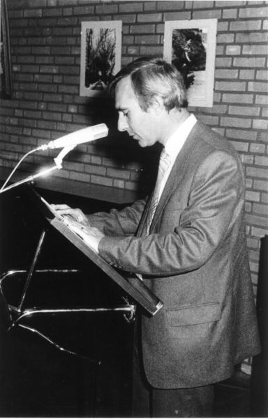 25-jarig jubileum Jan Houwers, Jeu Simons en Bert Berkx. De heer B. Berkx spreekt namens de jubilarissen een dankwoord uit. |