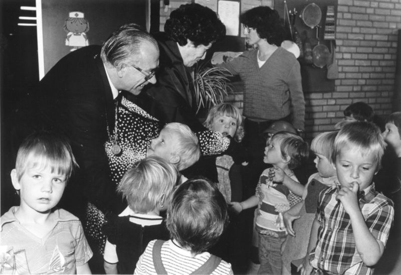 Gemeentehuis / Gemeentebestuur | Viering 25-jarig ambtsjubileum burgemeester J.T. Hendrix. Felicitaties door de kinderen van de peuterspeelzaal Pinkeltje aan de jubilaris. | Rijksweg 41 | Reuver | 16-6-1978 | 1978 | |||