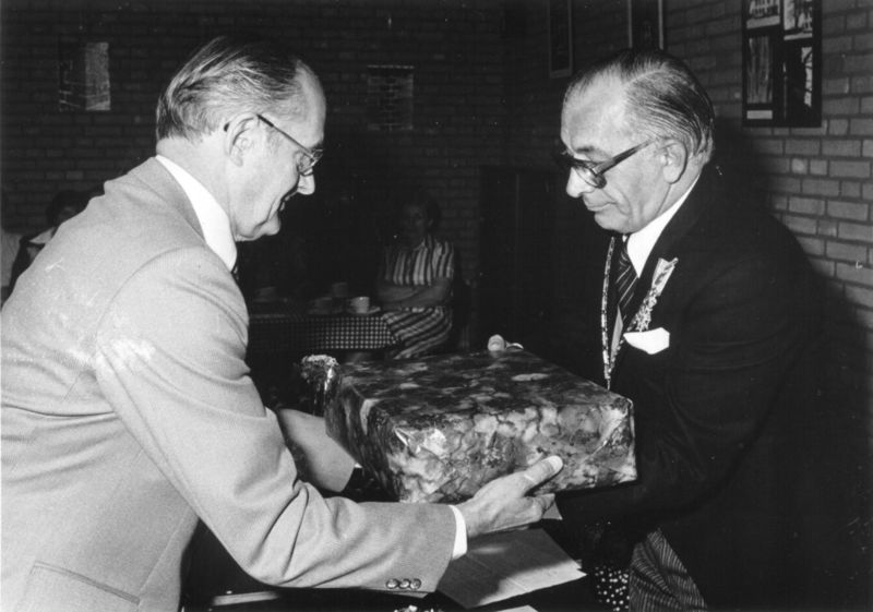 Gemeentehuis / Gemeentebestuur | Viering 25-jarig ambtsjubileum burgemeester J.T. Hendrix. In een buitengewone raadsvergadering in het gemeenschapshuis "De Schakel" overhandigt secretaris R.E.C. Hover namens het personeel een cadeau aan de jubilaris; een schrijfmachine. | Rijksweg 41 | Reuver | 16-6-1978 | 1978 | |||