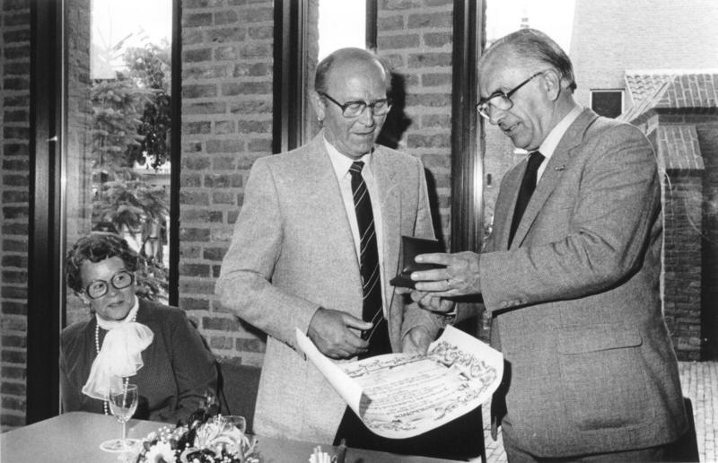 Gemeentehuis / Gemeentebestuur | Afscheid J.H. Levels. Burgemeester J.T. Hendrix reikt de erepenning in brons en de daarbij behorende oorkonde uit. | Raadhuisplein 1 | Reuver | 18-6-1982 | 1982 | |||
