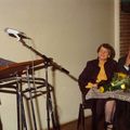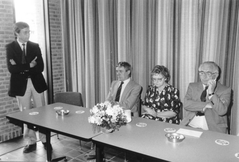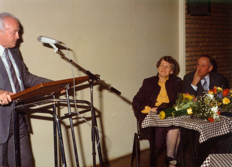 Op 30 december 1982 werd er in een buitengewone besloten vergadering afscheid genomen van gemeentesecretaris Hover. 2e loco-secretaris P. van Lier tijdens zijn toespraak. v.l.n.r. P. van Lier, mevr. Hover, secretaris Hover. |