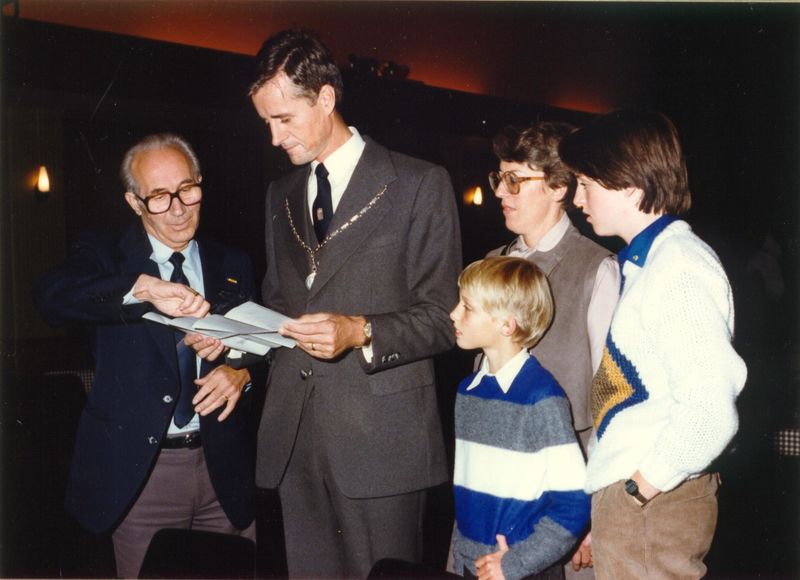 Gemeentehuis / Gemeentebestuur | Installatie drs. C.A.C.M. Nuytens tot burgemeester. De Heer Naus van het bejaardenzangkoor Zanglust Reuver-Offenbeek overhandigt burgemeester Nuytens een in het dialect geschreven Limburgs lied en de vertaling in het Nederlands. | Raadhuisplein 1 | Reuver | 1-10-1983 | 1983 | |||
