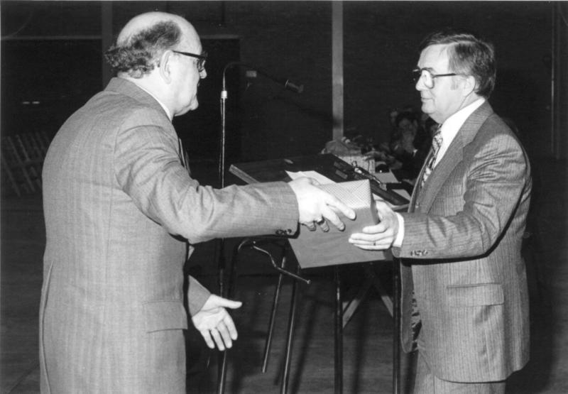 Officiële opening sporthal de Schans Op de foto wordt de bedenker van de naam "De Schans", dhr. Janssen, bedankt |