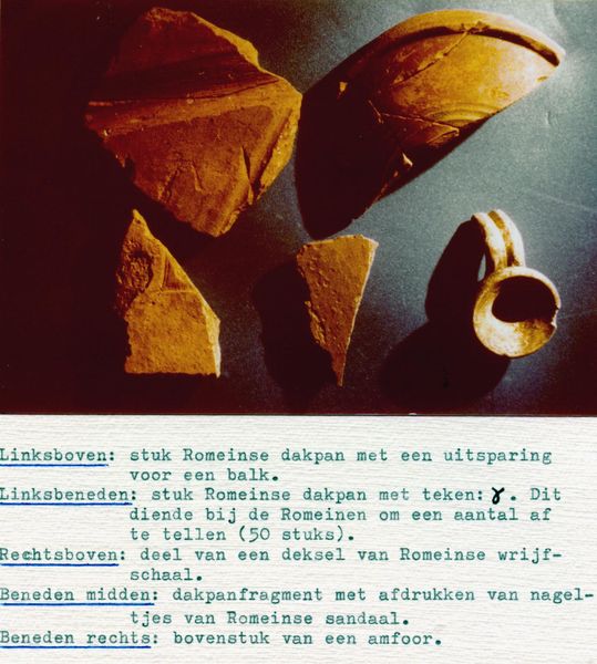 Archeologie | Proefopgraving van een Romeinse villa bij de Solberg (aan de Bovenste Solbergweg) 1978. Scherfjes met versiering behorende tot een voorraadvat. (dolium) | Bovenste Solbergweg | Beesel | 1978 | ||||