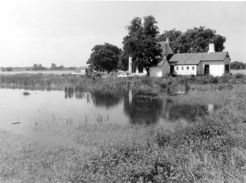 Gebeurtenissen | Als gevolg van hevige regenval in juli 1980 trad de Maas buiten haar oevers. Voor zover bekend bereikte de Maas de hoogste waterstand in de zomer. Rechts op de foto is nog juist zichtbaar de gevels van boerderij Klerkenhof te Beesel. | Klerkenhofweg 6 | Beesel | 1980 | ||||