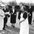 Bezoek Koningin Juliana aan Reuver. v.l.n.r. Koningin Juliana, Burg. Claessen (half zichtbaar), Gouverneur Houben met echtgenote, Mevr. Claessen, Laumans, N.N., Juffrouw Rijnders van de lagere school, secretaris van Kempen en echtgenote. |