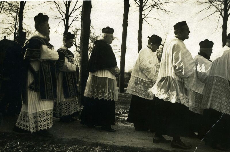 Kerk en religie | Begrafenis van emeritus-pastoor Jacq. Vrancken op het kerkhof te Reuver 2 februari 1929. De absoute wordt verricht door J. Van Oppen, deken van Venlo. Hij wordt geassisteerd door kapelaan Peeters van Reuver en kapelaan Schreurs van Beesel. Aan de voet van de baar N. Viegen, pastoor te Reuver. | Karel Doormanlaan 2 | Reuver | 1900 | ||||
