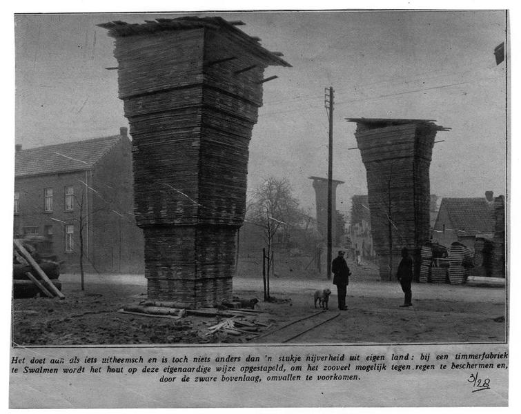 Diversen | Bij een timmerfabriek in Swalmen werden deze stapels hout gemaakt om deze te beschermen tegen weersinvloeden. | Swalmen | 1928 | |||||