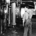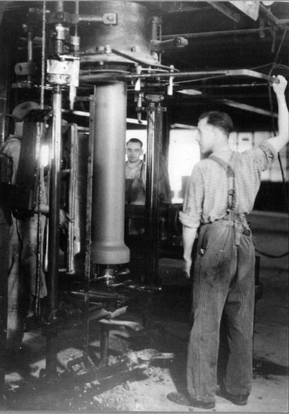 Fabrieken / Bedrijven | Chris Houwers (op de achtergrond) aan de buizenpers in de gresbuizenfabriek van Teeuwen | Keulseweg 36 | Offenbeek | 1946 | ||||