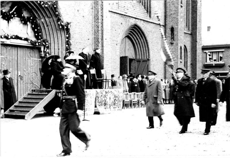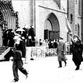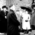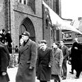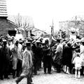 Op 28 maart 1950 vierde pastoor Gerard Stoot zijn zilveren priesterfeest in Reuver. De schutterij Sint Barbara paradeert voor de pastoor. |
