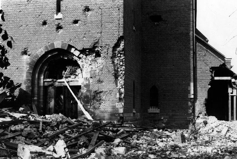 Kerk en religie | De zwaar beschadigde Sint Gertrudiskerk uit Beesel direct na de oorlog in 1945. | Kerkplein 2 | Beesel | 1945 | ||||