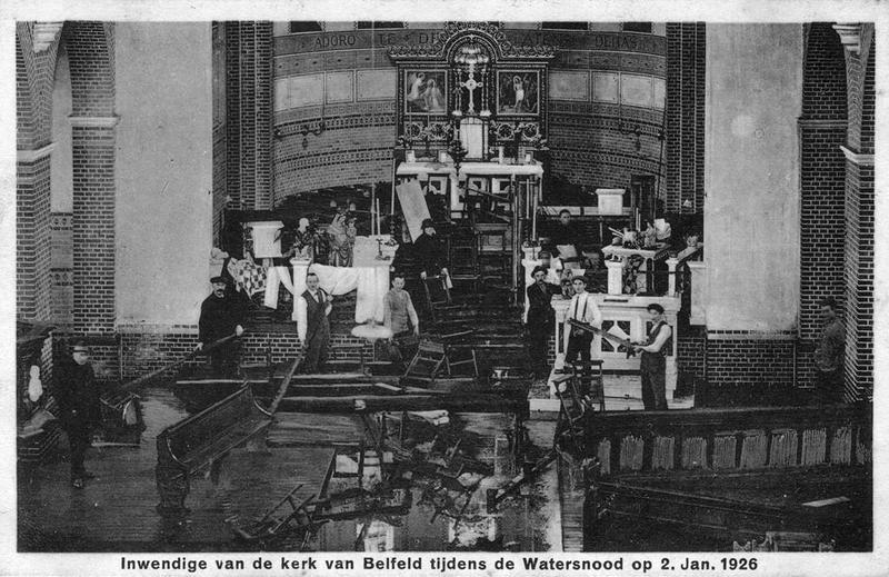 Kerk en religie | Het inwendige van de Urbanuskerk in Belfeld tijdens de watersnood in 1926. | Urbanusstraat | Belfeld | 2-1-1926 | 1926 | |||