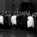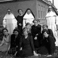Zusters van het H.Hart klooster, Van Links naar rechts: Zr. Eugenia, zr. Adeltruda, zr. Cleta, Zr. Ursuline, zr. Maria-Vincentia, zr. Carissima, zr. Cypriana (het kleine zustertje van de bewaarschool). Vooraan: José Bosmans mgr. Lemmens, Mia Bosmans. |