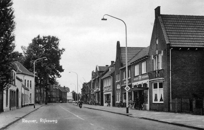 Wegen | Prentbriefkaart van het centrum van Reuver met hierop achtereenvolgens rechts de winkel van Tim's boekhandel, Cremers drogisterij, Teeuwen - Hermans hoedenmode en links Lei Peeters (meubels), de brandweerkazerne en het gemeentehuis. | Rijksweg 22 | Reuver | 1965 | ||||