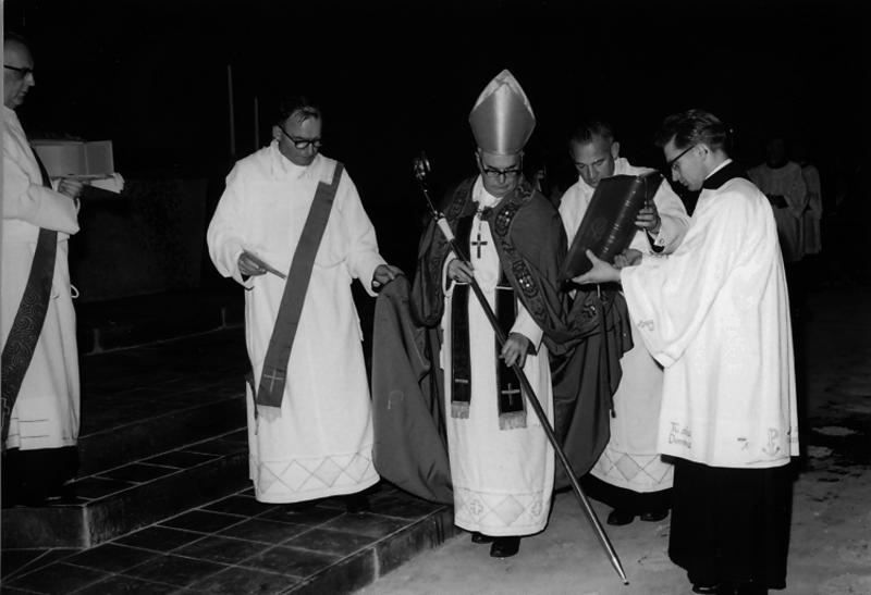 Kerk en religie | De bisschop Mgr. Moors wordt verwelkomd voor de inzegening van de Fatimakerk. | Pater Claretstraat 2 | Offenbeek | 13-12-1964 | 1964 | |||