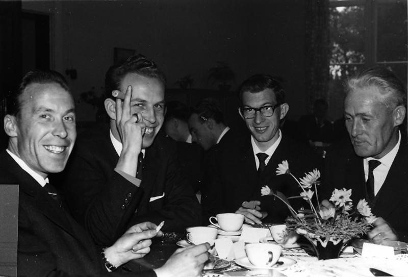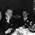 Kerk en religie | Na afloop van de steenlegging en inwijding van de Fatimakerk was er een receptie voor genodigden in Bondshotel café restaurant "De Beurs" in Roermond. Van links naar rechts: Wiel Levels, Frans Snellen. | Markt 25 | Roermond | 13-10-1963 | 1963 | |||