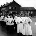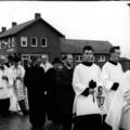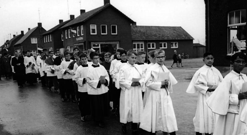 Kerk en religie | De misdienaars van de Lambertuskerk tijdens de processie ter ere van de eerste steenlegging van de Fatimakerk. | Keulseweg 99 | Offenbeek | 13-10-1963 | 1963 | |||