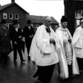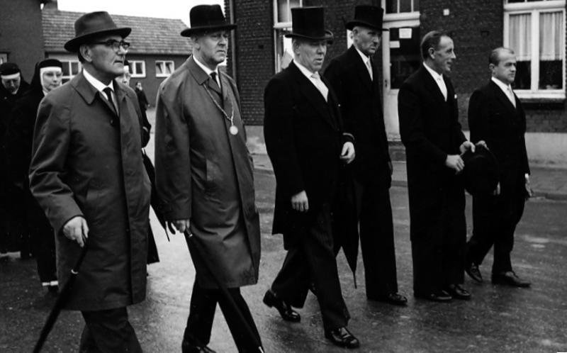 Kerk en religie | Burgemeester Mooren (2e van links) loopt mee tijdens de processie ter ere van de eerste steenleggingen van de Fatimakerk. | Keulsweg 99 | Offenbeek | 13-10-1963 | 1963 | |||