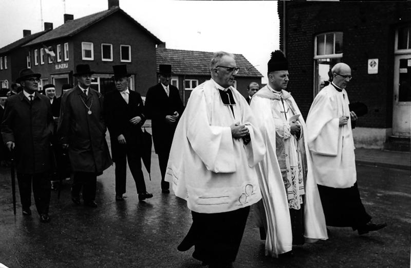 Kerk en religie | Eerwaarde P. Back, Mgr. P.J. van Odijk en deken Stoot temidden van het kerkbestuur tijdens de processie ter ere van de eerste steenlegging van de Fatimakerk. | Keulseweg 99 | Offenbeek | 13-10-1963 | 1963 | |||