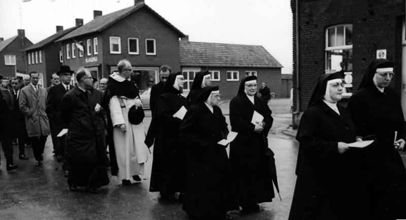 Kerk en religie | De zusters Dominicanen lopen mee met de processie ter ere van de eerste steenlegging van de Fatimakerk. | Keulseweg 99 | Offenbeek | 13-10-1963 | 1963 | |||