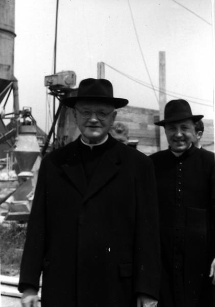 Bezichtiging van de in aanbouw zijnde Fatimakerk. Links -Engel Weijers. rechts - Pater Weis |