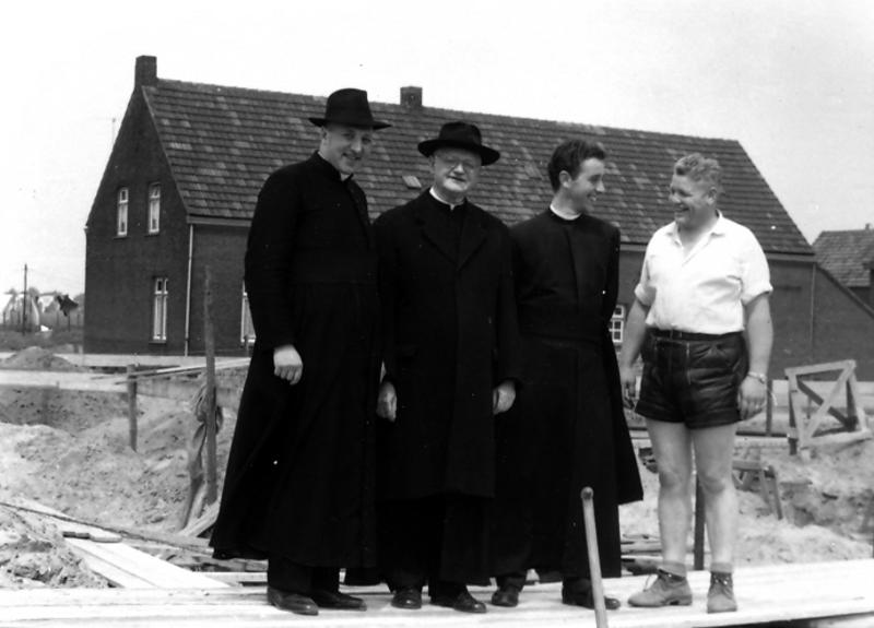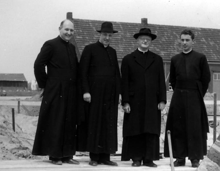 Kerk en religie | Enkele geestelijken en een bouwvakker bij de in aanbouw zijnde Fatimakerk. | Pater Claretstraat 2 | Offenbeek | 1963 | ||||