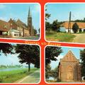 Prentbriefkaart met hierop diverse gebouwen en straten in Reuver. We zien onder andere de Pastoor Vranckenlaan (bij de Schakel), Ronckenstein, de maas bij het veer en de Lambertuskapel. |