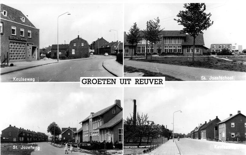Prentbriefkaart met diverse straten en gebouwen in Reuver. We zien onder andere de Keulseweg, De St. Jozefweg en de St. Jozefschool |