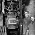De streng klei ("de Kook") wordt in de pers gelegd. Links zien we de kleistrengen en rechts de geperste pan op een kleiplankje.