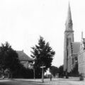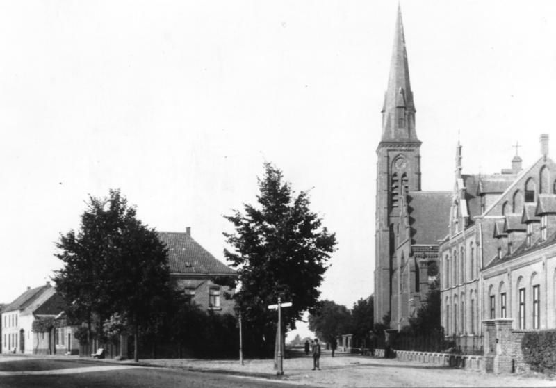 Links de woning van notaris Vogels. Frans Vogels was de eigenaar van de woning . Rechts de kerk, die sinds 1880 uit slechts 1 beuk (schip) bestaat met 2 zijbeuken. Verder het in 1890-1891 gebouwde klooster bestaande uit een woongedeelte met de kweekschool (gebouwd in 1900) l links en rechts de laagbouw van de meisjesschool en kleuterschool