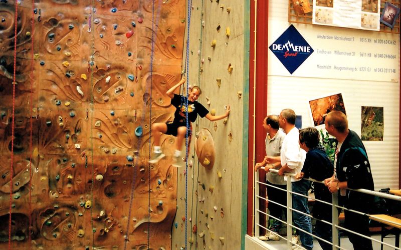 Tijdens het uitstapje van S.V. Hercules naar Boshoven kon er ook geoefend worden op het wand klimmen. De begeleiders houden een oogje in het zeil.
