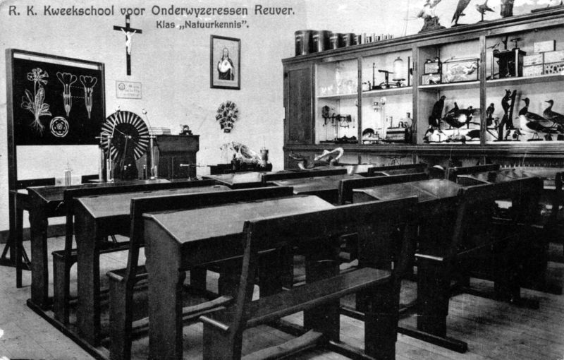 Prentbriefkaart met hierop de klas waarin de “Natuurkennis” van de kweekschool voor onderwijzeressen in Reuver werd gegeven.