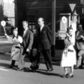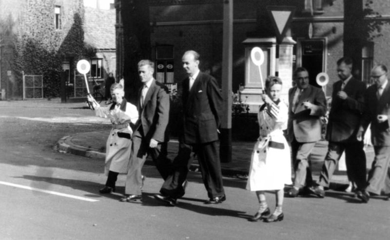 De jeugd verkeersbrigadiers helpen diverse personen met het oversteken.