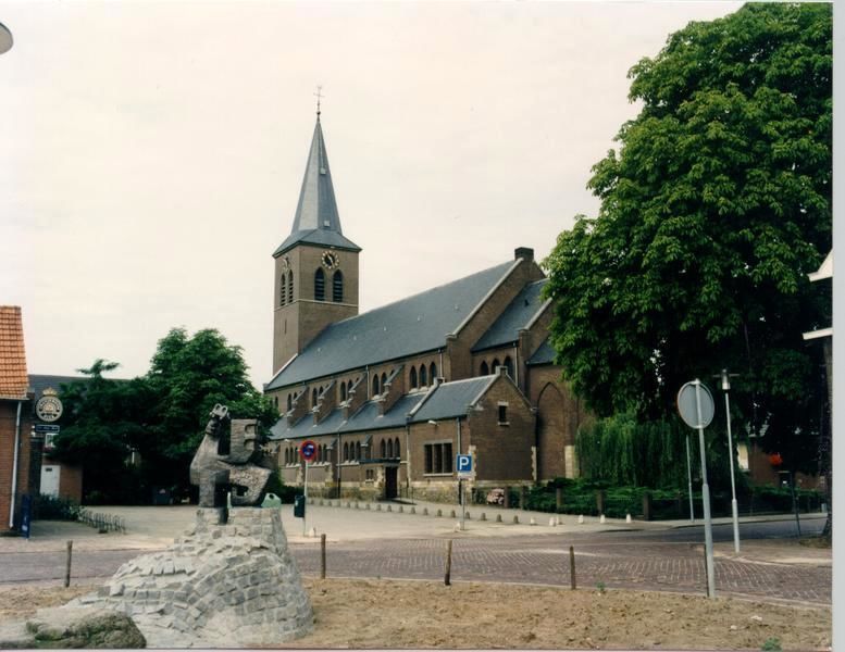 St.-Gertrudiskerk Beesel met op voorgrond het monument van de draak op het driehoekig pleintje.