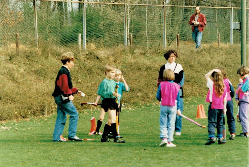 De jeugd krijgt les in het hockeyen.