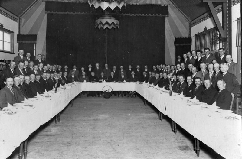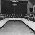 Groepsfoto van ? tijdens een gezamenlijk diner met in hun midden burgemeester Meuter.