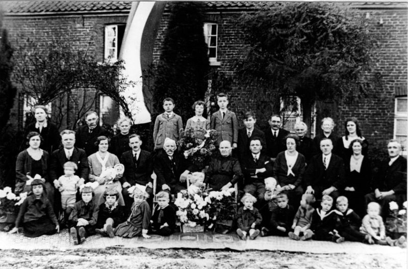 Van links naar rechts: bovenste rij: 1 NN, 2 Andries Geyzen, 3 Alda Brouns, 4 Math Beurskens, 5 Mia Vossen, 6 Math Vossen, 7 NN, 8 NN, 9 NN, 10 Mevr. Vossen (Schelkensbeek), 11 Truus Vossen. zittend: 1 NN, 2 Handrie Vossen, 3 Virginie Vossen, 4 Pierre Corstjens, 5 Ties Vossen (bruidegom), 6 Leen Maas (bruid), 7 Sef Vossen, 8 Lies Houben, 9 Bér Vossen, 10 Willemien Vossen, 11 Cornelis Beurskens, op de grond: 1 Wies Simons - Beurskens, 2 NN, 3 NN, 4 (baby NN), 5 Leonie Vullers - Vossen, 6 To Corstjens, 7 Eugéne Vossen, 8 NN, 9 Huug Vossen (staande), 10 Pierre Beurskens, 11 Paula Vossen, 12 NN, 13 NN, 14 NN namen: Jo Thijssen