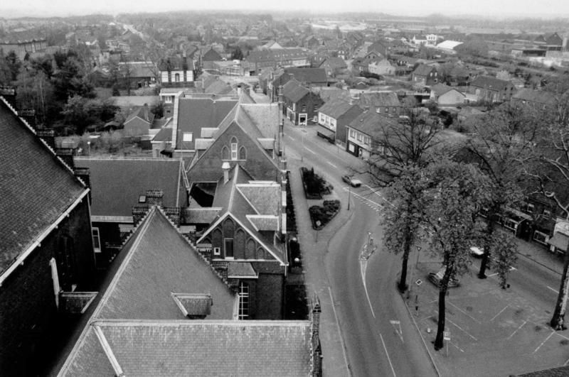 Beeld van de Rijksweg in Reuver gezien vanaf de kerktoren.