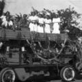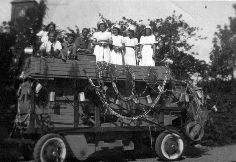 Op de foto Piet de Vlieger met diverse andere mensen op een dorsmachine.