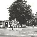 Prentbriefkaart met hierop de garage G.(Lei) Jacobs op de markt in Belfeld. Links op de foto zien we het huis van Gies van Schreurs die er een jeugdcafé had.