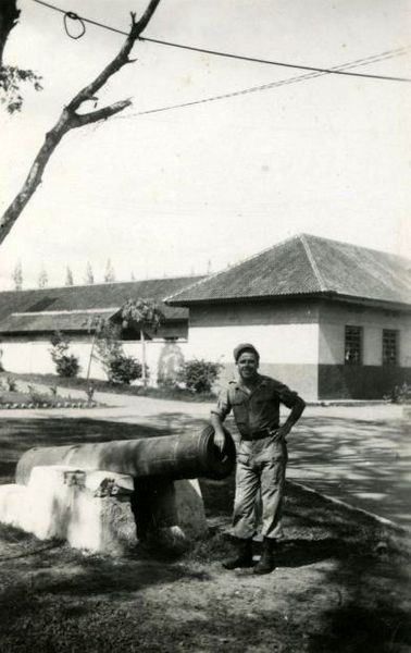 Verblijf en optreden van het 8e (4e) Bataljon Regiment Stoottroepen in Nederlands-Indië. Harrie Wuts ('De Sjeuk') uit Swalmen poseert bij een kanon bij de benteng in Palembang.