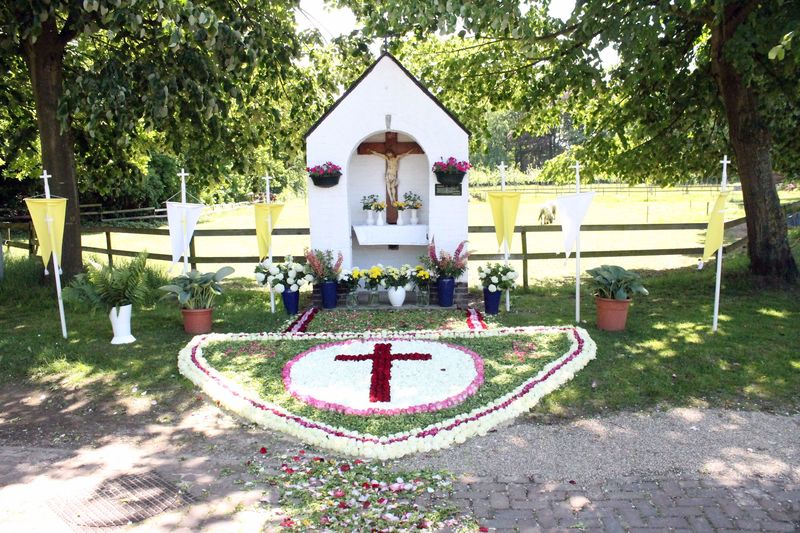 Tijdens de processie werd de omgeving bij de Kasteelkapel ook met een mooi bloementapijt versierd.