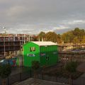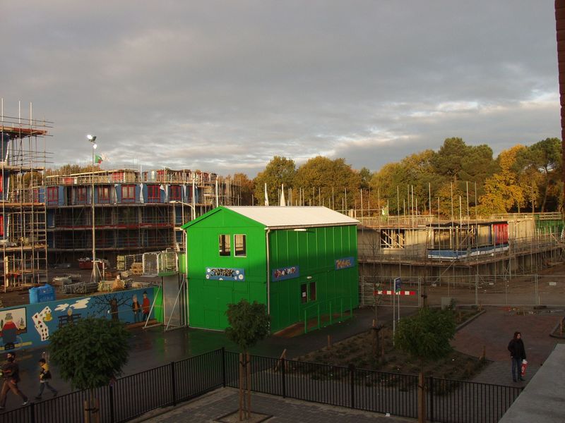 Vanuit het groene gebouw kan het publiek de vordering van de gebouwen aan de Bösdaellaan gade slagen.