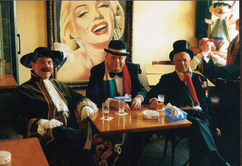 Carnaval met Jack Linssen, Broer Geraeds , Gerard Lighthart en op de achtergrond Roy Verstappen in restaurant Pinocchio.