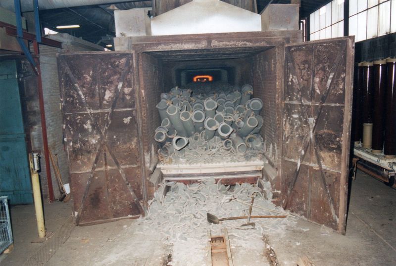 Bij het bakken van de gresbuizen gaat er ook wel eens iets mis, getuige de oven compleet gevuld met kapotte buizen bij Greswarenindustrie NGI..
