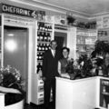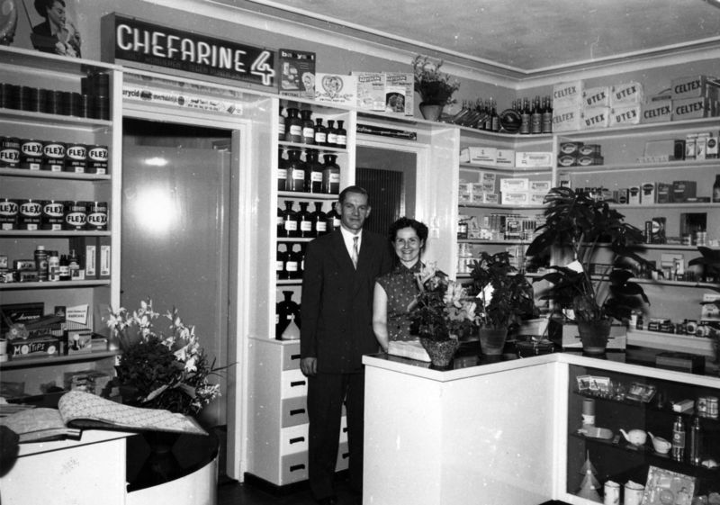Het echtpaar R. Jochijms - Huberts in hun drogisterij, schildersbedrijf en parfumerie.