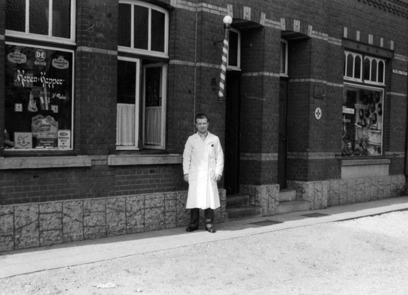 Kapper Jeu Peulen voor zijn zaak aan de Wilhelminastraat